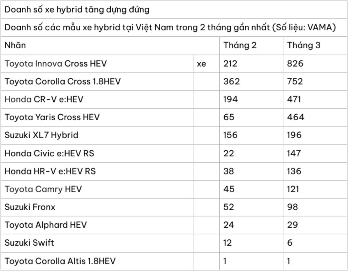 Từ đầu năm 2024, Hiệp hội các nhà sản xuất ôtô Việt Nam (VAMA) đã bắt đầu công bố số liệu bán hàng chi tiết của các mẫu xe hybrid, giúp phác họa rõ nét hơn quy mô và sự phát triển của phân khúc này tại Việt Nam. Báo cáo doanh số tháng 3 đặc biệt nổi bật với đà tăng trưởng mạnh mẽ của thị trường xe hybrid, diễn ra sau kỳ nghỉ Tết Nguyên đán và cùng thời điểm chính sách ưu đãi thuế Tiêu thụ đặc biệt có hiệu lực, tạo ra lợi thế về giá bán cho người tiêu dùng.