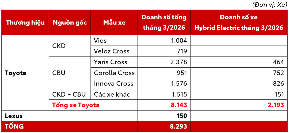 Doanh số tháng 3/2026 của Toyota Việt Nam bứt phá ấn tượng